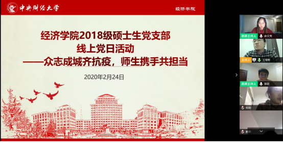 为深入学习贯彻习近平总书记关于疫情防控的重要讲话和指示精神,坚决打赢疫情防控的人民战争、总体战、阻击战,积极响应学院党委要求,det365官方网站登录2018级硕士生第一、二、三党支部联合教工党支部,于2月24日开展线上主题党日活动。det365官方网站登录院长陈斌开、组织员刘滨、政治经济学系何召鹏、党务秘书窦宗玥等老师与2018级60余名硕士生党员、入党积极分子共同参与活动。活动由2018级硕士生第三党支部书记王继彬主持。