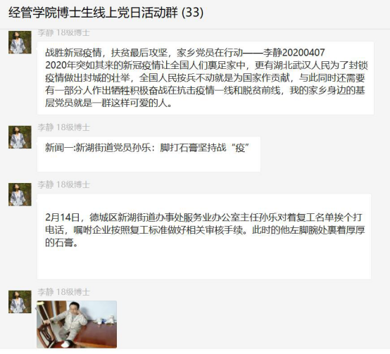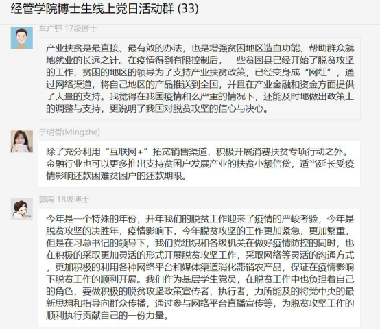 为贯彻中央“决战决胜脱贫攻坚座谈会”会议精神,有效推动疫情防控和基层组织建设紧密结合,det365官方网站登录2016级、2017级、2018级博士生党支部于2020年4月7日联合微观经济学系教工党支部,开展“深化爱国教育,助力脱贫攻坚”线上党日活动。活动由2016级博士生党支部书记于明哲主持,微观经济学系教工党支部书记周战强老师参与指导,活动分为线上线下两个部分。