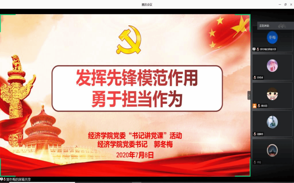 2020年7月8日晚19:00,det365官方网站登录党委“书记讲党课”活动在腾讯会议平台举行。det365官方网站登录党委书记郭冬梅教授、组织员刘滨老师出席,2020年发展对象、2019-2020年第二学期入党积极分子参与学习,会议由党务秘书窦宗玥老师主持。