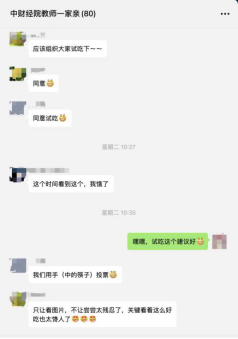 随后,为确保公平并进一步充分动员教职工的积极性,学院分工会在“中财经院教师一家亲”微信群中发起投票。投票规则要求每位老师对自己心仪的菜品投票,最多投10票,并将按照票数高低决定一、二、三等奖。投票一开始,引起了学院老师们的强烈兴趣,老师们展开了热烈的讨论,纷纷表示每道菜品都很美味,期待下次开展线下试吃品鉴会。