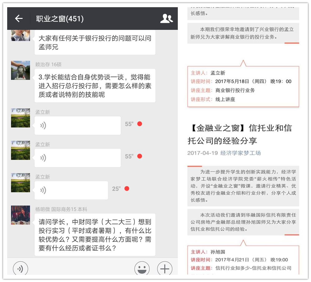 为进一步提升学生的创新实践能力,经济学家梦工场邀请“数链智库”,开设“金融业之窗”微课,邀请行业精英、优秀校友进行金融业介绍和行业分析,分享个人成长感悟。本学期,邀请优秀校友中泰证券债券与结构金融部执行总经理段涛、华融国际信托有限责任公司房地产金融部总经理孙旭国、兴业银行香港分行资本市场部董事总经理孟立新开展主题为“从资产证券化讲起——证券公司都在做些什么”、“信托行业知多少——信托业和信托公司的经验分享”、“商业银行投行业务”3场微课堂,带领同学们了解各行各业的特色内容和基本工作,引领学生初步认识行业。