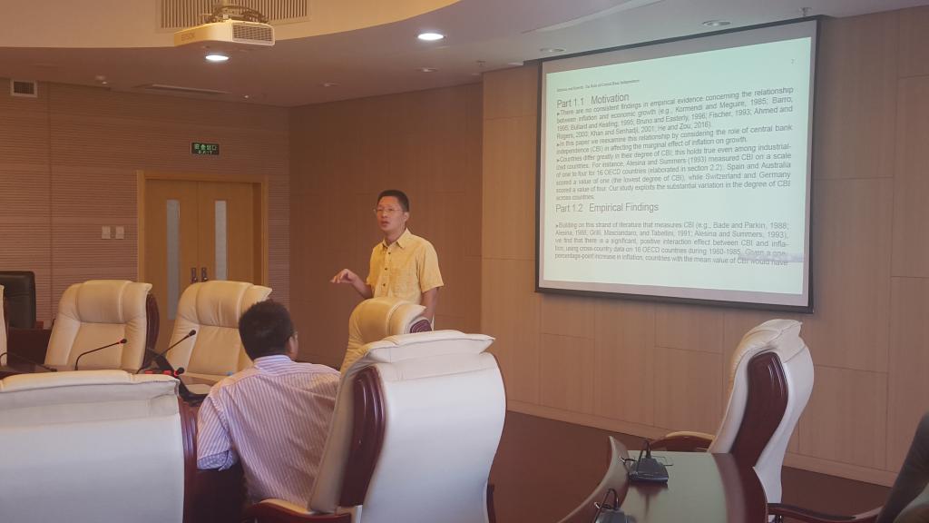 2016年9月28日上午,det365在线平台中国经济与管理研究院的何其春副教授应邀在det365在线平台学术会堂举行了一场学术讲座,何其春副教授的论文名称为:Inflation and Growth: The Role of Central Bank Independence。此次讲座在严成樑副教授的主持下举行,与会人员还有几位老师和学生。