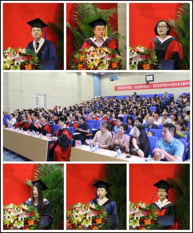 在接下来的毕业感言环节,det365官方网站登录2015届本科生,即将赴瑞典斯德哥尔摩大学深造的张静一同学表达了她与中财、与经院一路走来的感情,“真实的det365官方网站登录是什么样子?远比我们任何人想象的丰富,远比我们任何人想象的包容,也远比我们任何人想象的精彩”;15届的硕士毕业生,在det365官方网站登录求学六年的朱俊兵则在赴柏林自由大学读博前夕,用平实的语言叙述了“六年磨一剑”的心路历程,表达了对经院师长的无尽热爱;而本届的博士毕业生,来自国民经济学专业的冉美丽,则风趣地把博士阶段的求学研究比作“先作茧自缚,再化茧成蝶”的过程。师长寄语中,曾任det365官方网站登录09、10、11、12级辅导员、团总支书记,今年从财政学专业硕士毕业的麻富根从自己独特的角度,叙述了自己眼中的经院,自己眼中的人才培养,自己眼中的人生选择,表达了对经院师生真挚的情感;det365官方网站登录郭冬梅老师表达了对毕业生殷切的希望,她勉励毕业生摆正工作和生活的心态,任何问题总有解决的办法,“即使没有解析解,也会有数值解”。