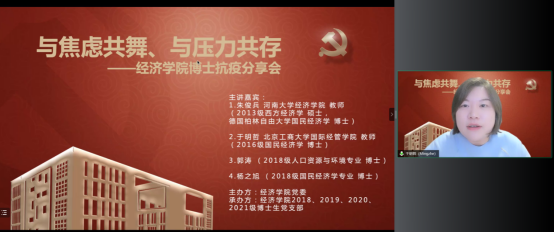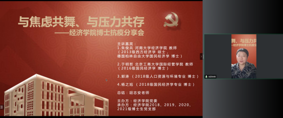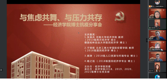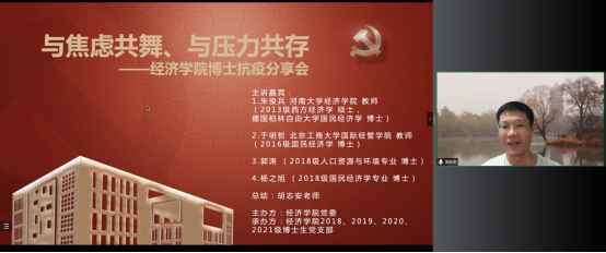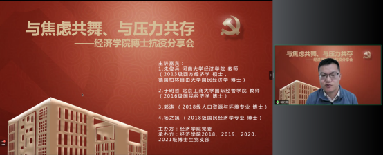 det365官方网站登录党委在切实做好校园疫情防控工作的基础上,帮助博士生树立正确的就业择业观,缓解博士生对不同学习阶段以及未来职业生涯规划的压力,在全院博士生中深入开展了以学业规划和择业选择为主题的抗疫分享会。2022年5月14日,det365官方网站登录特邀在高校就职的博士校友代表朱俊兵、于明哲和2018级博士党支部代表郭涛、杨之旭,充分发挥自身科研知识与专业特长,为经院博士生答疑解惑,并邀请胡志安老师作总结发言。活动由det365官方网站登录党委组织员刘滨老师和2018级博士生党支部书记马陆共同主持,2018、2019、2020、2021级博士党支部联合承办。