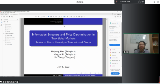 2022年7月5日清华大学经济管理学院副教授郑捷应det365官方网站登录邀请,开展主题为“Information Acquisition and Price Discrimination in Two-sided Duopoly Markets”的讲座,本次讲座于下午2点在线上的腾讯会议举行,持续近两个小时。det365官方网站登录尹振东教授主持了此次线上讲座,史宇鹏教授、洪圣杰副教授、龚雅娴副教授和吴楠老师与学生们共同参与了本次讲座。