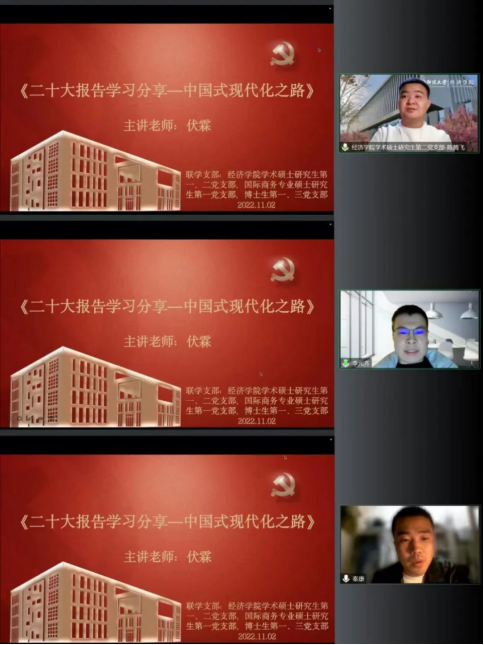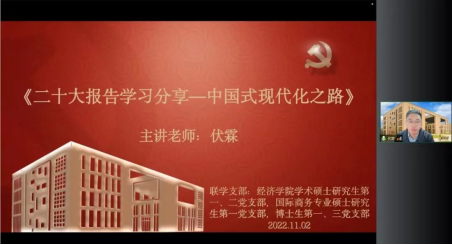 2022年11月2日,det365在线平台det365官方网站登录党委委员、副院长伏霖为det365官方网站登录学术硕士研究生第一、二党支部,国际商务专业硕士研究生第一党支部,博士生第一、三党支部作主题为“二十大报告学习分享——中国式现代化之路”的专题讲座。博士研究生第三党支部书记冯博主持活动,80余位师生党员及入党积极分子线上参加。