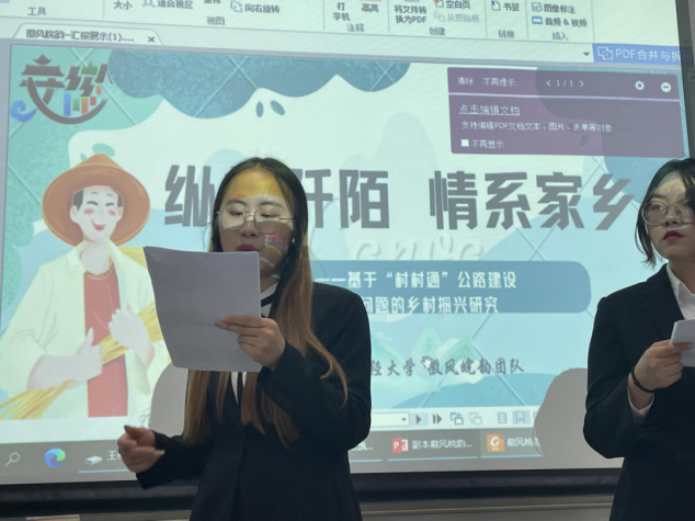 “徽风皖韵”队是参与答辩的第三支团队,他们深入乡村发展现实,用脚步丈量大地,以乡村公路为着眼点,深入探讨“村村通”道路的发展现状、成就及问题。他们以安徽省霍邱县的乡村公路和农村道路作为调研对象,在线上实践中,团队进行了网络舆情大数据处理和问卷调查分析;线下实践中,团队采访了霍邱县上颍村和双庄村党支部书记以及多户农村村民,获得大量农村发展一手资料。评委老师认为,该项目调研成果可视化且与农村发展密切关联,建议把网络舆情分析部分的数据处理详细化、专业化,并相信该项目未来能够有进一步发展。