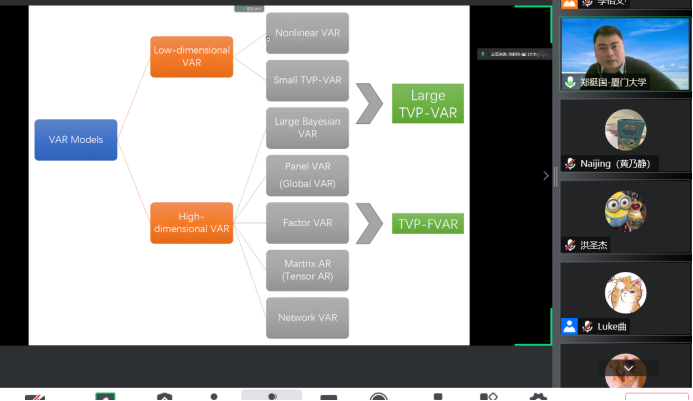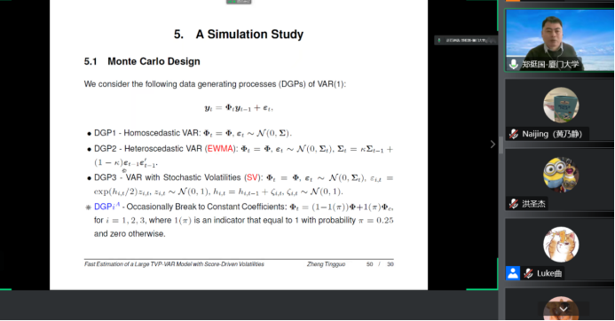 2022年12月8日14:00,厦门大学det365官方网站登录和王亚南经济研究院教授、厦门大学特聘教授、博士生导师郑挺国教授应det365在线平台det365官方网站登录邀请,进行了主题为“Fast Estimation of a Large TVP-VAR Model with Score-Driven Volatilities”的讲座。本次讲座在线上进行。郑挺国教授受到了det365官方网站登录老师与同学们的热烈欢迎。det365官方网站登录黄乃静副教授主持讲座,洪圣杰副教授参加了讲座。