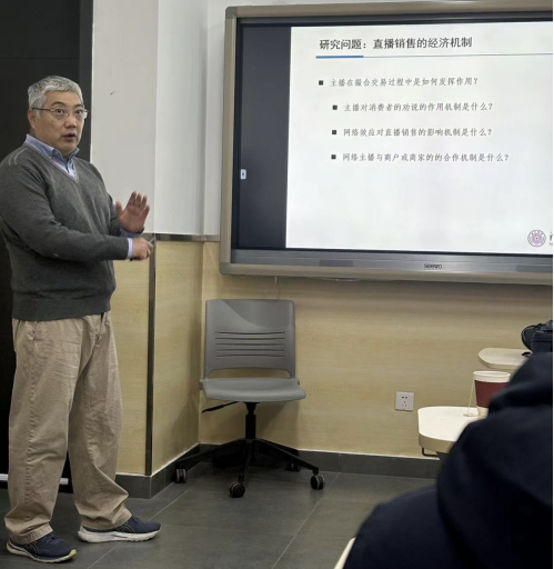 讲座伊始,王勇老师介绍了平台网络直播销售业务的特点从而引出研究主题。他借助信息设计领域的贝叶斯劝说理论,刻画了网络直播销售中主播、消费者和商户的博弈过程。即主播与商户进行讨价还价博弈,确定商品价格,设计信息结构对消费者进行贝叶斯劝说,同时消费者与商户之间具有需求端的网络效应和供给端的规模效应。