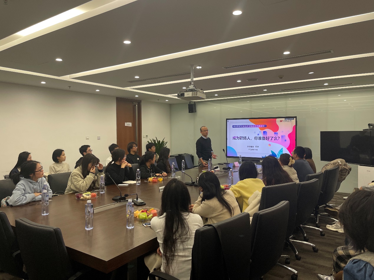 校友徐悦分享了她的求职历程以及在万联证券工作的经历。她围绕券商资管业务范围、与银行理财的区别、个人职业发展路径等话题进行了精彩讲述。在分享末尾,徐悦针对同学们的问题进行了答疑解惑,为同学们提供了宝贵的行业见解和求职指导。