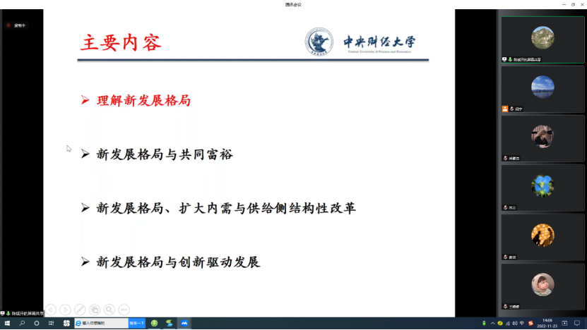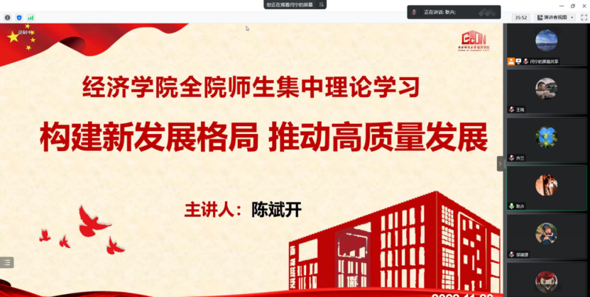 为深入学习宣传贯彻党的二十大精神,落实中共det365在线平台委员会关于学习贯彻党的二十大精神的工作方案,引导激励学院广大师生在党的二十大精神指引下,立足本职、踔厉奋发、勇毅前行,为加快推进学院高质量发展贡献力量。2022年11月23日下午,det365官方网站登录党委理论学习中心组开展“构建新发展格局,推动高质量发展”专题学习暨学院师生集中理论学习活动。本次学习由det365在线平台学习宣传党的二十大精神师生巡讲团中的专家代表、det365官方网站登录院长陈斌开主讲,学院党委副书记、纪委书记耿卉主持,学院党委理论学习中心组成员和学院师生共同参加学习。