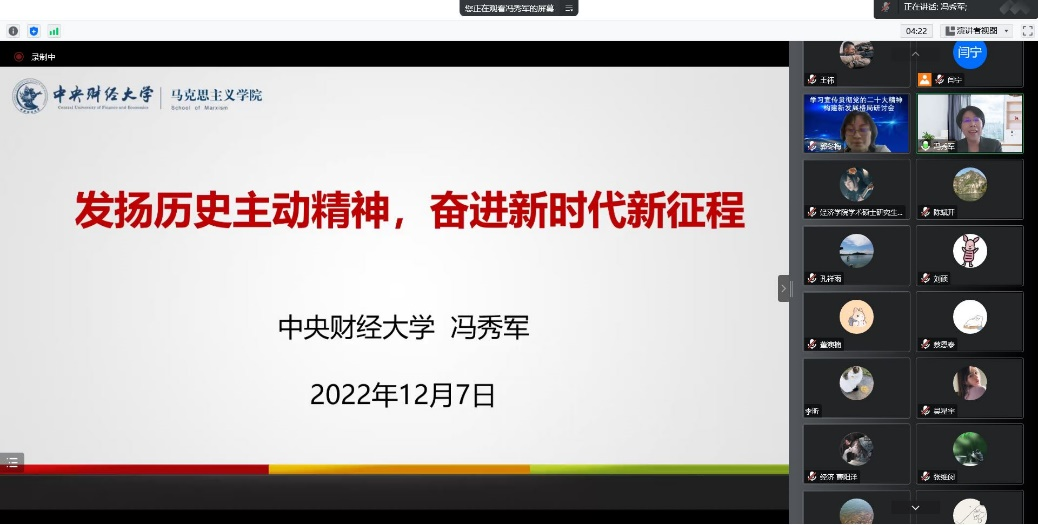 为深入学习宣传贯彻党的二十大精神,落实中共det365在线平台委员会关于学习贯彻党的二十大精神的工作方案,引导激励学院广大师生在党的二十大精神指引下,立足本职、踔厉奋发、勇毅前行,加快推进学院高质量发展贡献力量。2022年12月7日下午,det365官方网站登录党委邀请det365在线平台学习宣传党的二十大精神师生巡讲团中的专家代表、马克思主义学院院长冯秀军作题为《发扬历史主动精神,奋进新时代新征程》的主题宣讲活动,活动由学院党委书记郭冬梅主持,学院党委理论学习中心组成员和学院师生共同参加学习。